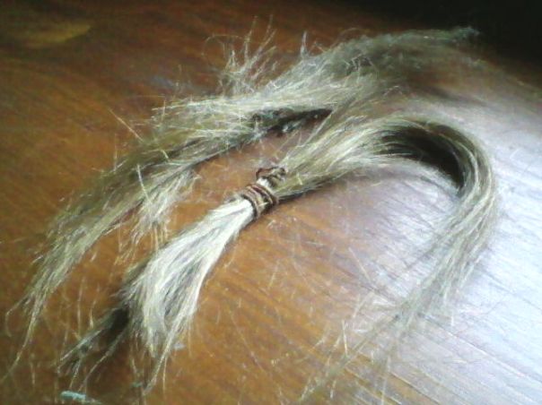 Once it was a cloth pouch held together by straight pins with interesting things taped to it and a lock of hair inside. Yesterday I found the hair behind my dresser, where it had probably fallen years ago, slowly pushed off the edge by encroaching clutter. It was filled with dust, brittle and breaking from the hot summers in an old house, and the rubber band was rotting away. I took a photo and felt strangely sad as I threw it away, thinking of a time in my life when beautiful things happened mysteriously.