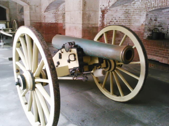 While at the fort I participated in a demonstration loading a field artillery piece, a twelve pound Napoleon gun. The ranger presiding clearly tried to give preference to children, but since only two kids were interested in working with the old gun, I got to play too. I don’t recall what my actual job was called, or even if it had a name, but my duty was to cover the touchhole while the gun was loaded, and then pierce the cartridge to prepare it for firing. My commanding gunner, a boy about 8 years old, did a fine job maintaining discipline and giving clear orders. Special mention should go to the ramrod operator, a little girl who could barely lift the big pole but nevertheless enthusiastically swabbed the barrel and ran the shot home. A fine crew, all of them.